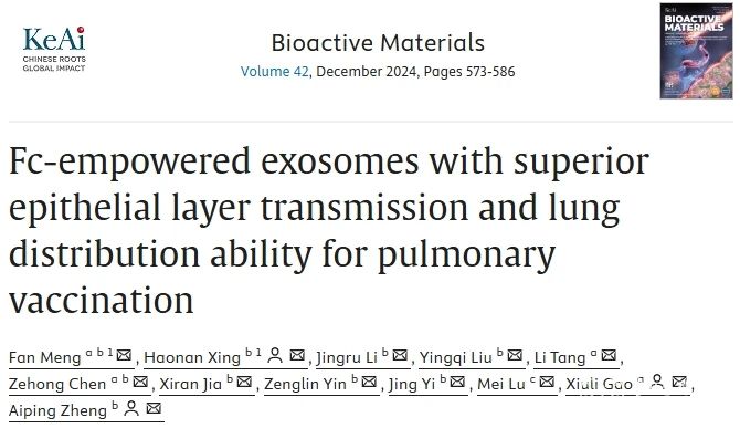 Fc-empowered exosomes with superior epithelial layer transmission and lung distribution ability for pulmonary vaccination.Bioact. Mater2024 Sep 12:42:573-586. doi: 10.1016/j.bioactmat.2024.08.015.