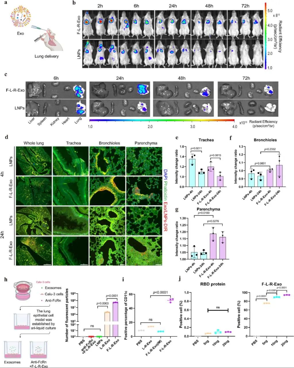 通过对不同修饰的外泌体诱导的免疫效应的评估,作者深入了解了外泌体中Fc蛋白嵌合状态对小鼠气管内给药的影响,以及不同接种方式引起的免疫应答的差异。当通过气管给药时,F-L-R-Exo引起了强大的细胞免疫反应,具有良好的稳定性和较高的抗原负载能力。此外,其在肺内的滞留时间延长,分布能力良好,与商业化的LNPs相比,F-L-R-Exo被证明是一种更先进的黏膜递送系统。同时,通过气管内给药可使F-L-R-Exo穿透FcRn肺上皮细胞受体,从而激活黏膜免疫系统,诱导产生高滴度IgG抗体。这一过程还可触发高滴度IgA抗体的产生,激活额外的抗原呈递细胞,并刺激组织驻留的记忆T细胞,从而诱导全身免疫应答。