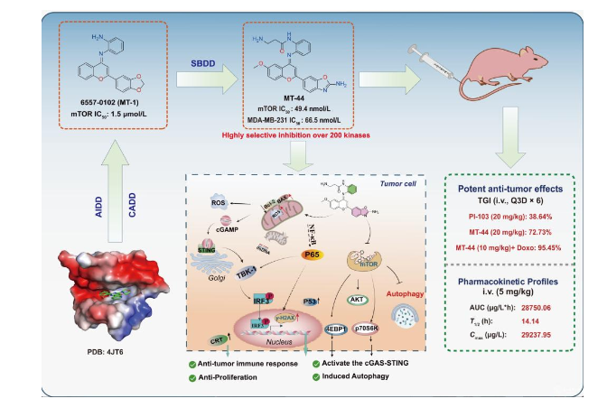 汤磊/张吉泉教授团队采用人工智能辅助药物设计(AIDD)与计算机辅助药物设计(CADD)联合策略,从150万化合物库中筛选出苗头化合物MT-1。随后采用基于结构的药物分子设计策略(SBDD),经多轮结构优化,最终获得高选择性mTOR抑制剂MT-44。该化合物具有纳摩尔水平的mTOR抑制和TNBC细胞增殖抑制活性,能有效阻断PI3K/Akt/mTOR信号通路,并在MDA-MB-231异种移植小鼠模型中展现出强效抗肿瘤效应。机制研究显示,MT-44在诱导肿瘤细胞自噬的同时,激活模式识别受体TLR2,上调cGAS/STING信号通路,并诱导细胞免疫原性死亡(ICD)。