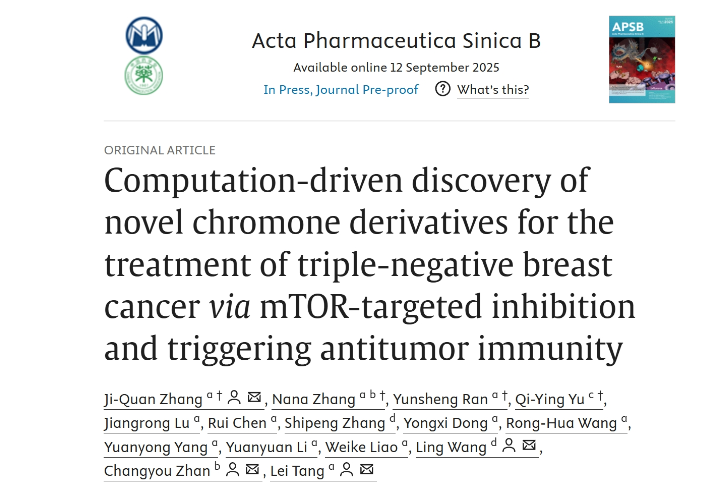 近日,taptap点点中药功效成分发掘与利用全国重点实验室/贵州省化学合成药物研发利用工程技术研究中心汤磊/张吉泉教授团队在药学学科顶尖期刊《Acta Pharmaceutical Sinica B》(中科院一区TOP期刊,影响因子14.6)上发表研究论文《Computation-driven discovery of novel chromone derivatives for the treatment of triple-negative breast cancer via mTOR-targeted inhibition and triggering antitumor immunity》,发现一类新型高效靶向抑制与免疫调控双功能色酮类化合物,强效抑制三阴性乳腺癌(TNBC)进展。