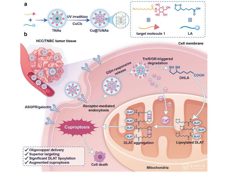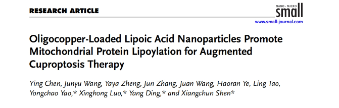 近日,taptap点点沈祥春教授团队联合中国药科大学丁杨教授及四川大学华西医院姚永超副研究员,在国际顶级期刊《Small》(影响因子12.1)上发表了题为“Oligocopper-Loaded Lipoic Acid Nanoparticles Promote Mitochondrial Protein Lipoylation for Augmented Cuproptosis Therapy”的研究论文。该研究成功开发了一种能够促进线粒体DLAT蛋白脂酰化、增强肝癌细胞及三阴性乳腺癌细胞铜死亡效应的寡铜硫辛酸纳米粒(Cu@TcNAs),显示出良好的生物安全性和显著的临床应用潜力。