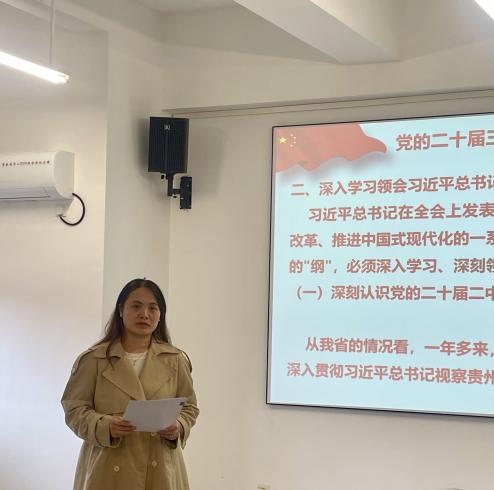 宣讲活动由学院书记高秀丽和副书记包欢欢担任主讲,两位老师紧扣“深刻领会和把握中共二十届三中全会精神”主题,深入学习《中共中央关于进一步全面深化改革、推进中国式现代化的决定》(以下简称《决定》)与贵州省委十三届五次全会精神,通过生动案例与精炼语言,围绕深刻认识党的二十届三中全会的重大意义、全面准确理解《决定》提出的进一步全面深化改革重大举措、全力以赴抓好全会精神贯彻落实等方面进行了系统解读。