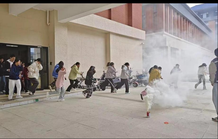 模拟火灾的情景中,急促的警铃声响彻云霄,烟雾弥漫。各班班长和安全委员听到警报后,第一时间拨打了校园消防电话,并同老师、辅导员积极组织同学安全有序的从教室撤离至空旷地带。同学们弯腰前行、掩住口鼻,在短时间内全部安全有序的撤出了模拟火灾现场。