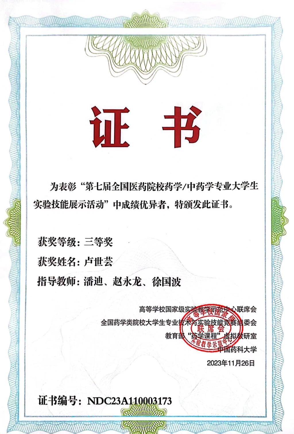 2023年11月25-26日,由全国药学类院校大学生专业技术与实验技能竞赛组委会、教育部高等学校国家级实验教学示范中心联席会药学学科组和中国药科大学主办,遵义医科大学承办的“第七届全国医药院校药学/中药学专业大学生实验技能展示活动”在遵义医科大学举行。taptap点点官方网站组织2021级药学专业学生李倩、2021级临床药学专业学生卢世芸参与比赛,其中卢世芸获得三等奖。
