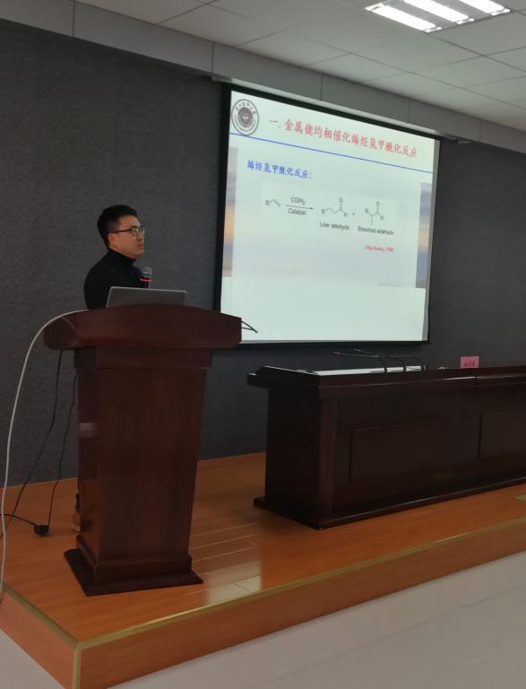 张林博士以自己的求学研究经历出发,以“离子液体在绿色有机合成中的应用”为主题,首先介绍了有机金属铑催化烯烃氢甲酰化反应研究,并对“铑”以及“烯烃氢甲酰化反应”进行说明,其次对目前从事的离子液体催化构建有机小分子进展研究进行详细讲解。讲座结束后,参会的老师和同学与张林博士进行了深入的沟通交流。报告取得圆满成功。