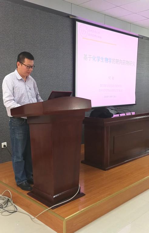 何彬博士以“基于化学生物学的靶向药物研究”为主题,介绍了化学生物学这门蓬勃发展的交叉学科。何彬博士介绍了化学生物学主要研究内容和学科特点,其基本思路和特点在于利用化学思想和手段去理解和调控生命体系,主要体现在以外源化学为核心思想,以化学探针为关键工具,以揭示生命本质并服务于化学为主要任务。并针对创新药物研究中的“靶标”和“先导化合物”的化学生物学问题,以化学探针为关键技术、结合结构生物学方法,开展组蛋白去乙酰化酶功能及其化学干预的基础研究,为创新药物研究提供候选新靶标发现以及先导化合物发现的理论基础和技术支撑。