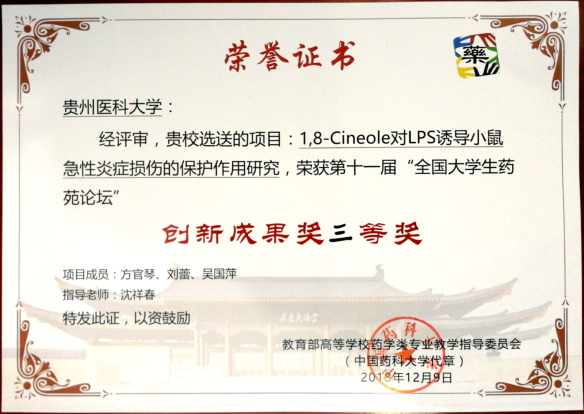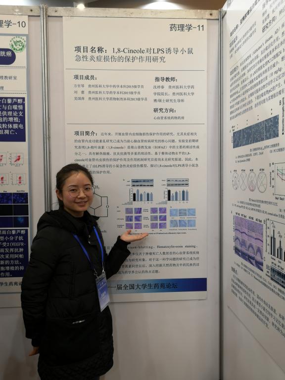 2018年12月7-9日,第十一届“全国大学生药苑论坛”在浙江大学紫金港校区举行,我院由2015级辅导员徐冉带队,2015级方官琴、刘蕾等完成的《1,8-Cineole对LPS诱导小鼠急性炎症损伤的保护作用研究》经过墙报比赛、论文评审、论文报告、现场提问以及论坛委员会评议等环节,最终获得创新成果三等奖。
