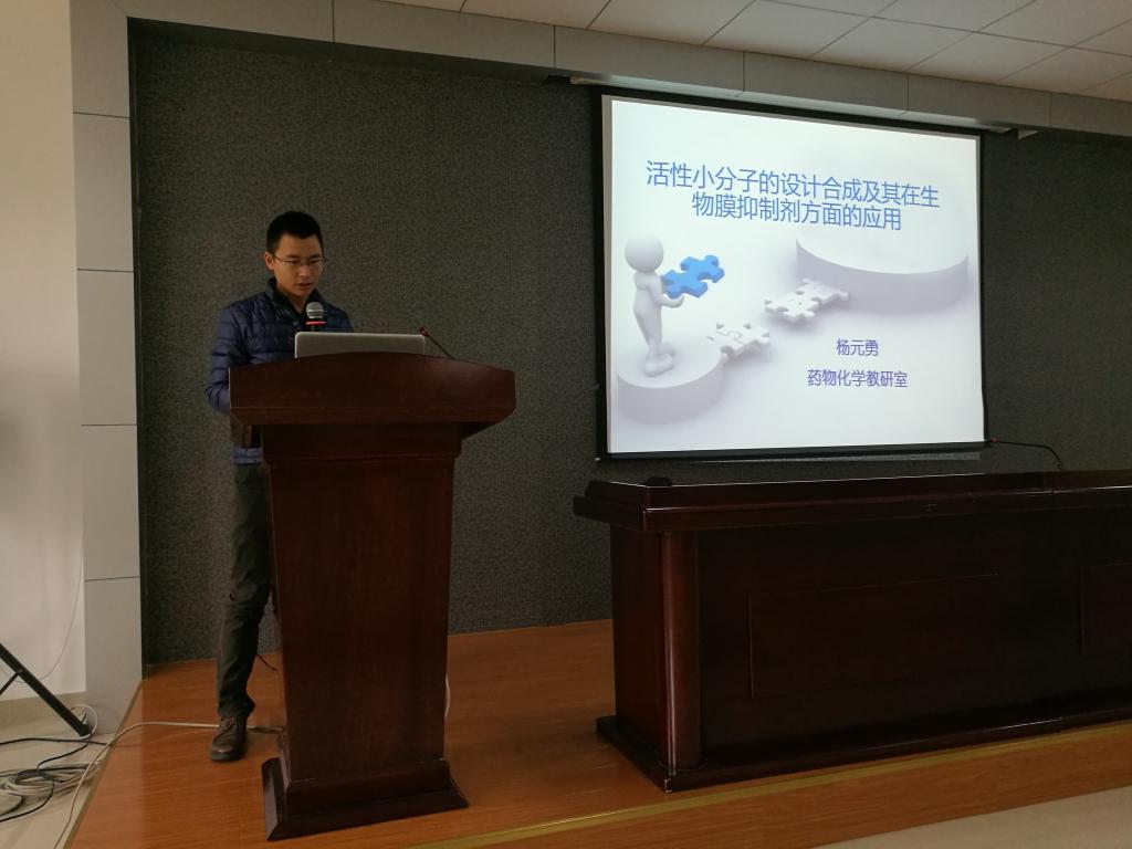 本次讲堂的题目是“活性小分子的设计合成及其在生物膜抑制剂方面的应用”。主讲人扬元勇博士结合自己工作经历和经验,介绍了目前使用的氧化剂制备的情况,比如制备困难,储存困难或者有毒有害等弊端,并通过自己课题的研究情况,介绍了用氧气作为绿色氧化剂将氧化吲哚制备过氧化吲哚,以手性钮盘五氮胍作为相转移制备了高立体选择性的过氧化吲哚,并且用方法证明了此反应为双步反应的机理。细菌生物膜是指附着于有生命或无生命物体表面被细菌胞外大分子包裹的有组织的细菌群体。生物膜中存在各种主要的生物大分子如蛋白质、多糖、DNA、RNA、肽聚糖、脂和磷脂等物质。生物膜细菌对抗生素和宿主免疫防御机制的抗性很强,能够增强细菌的耐药性10-1000倍,并且造成细菌的反复发作和难以治愈。经过对鲍曼不动杆菌自诱导剂结构的改造和活性测试发现2-氨基咪唑类衍生物对鲍曼不动杆菌的生物膜抑制作用较强在制定浓度下可以达到60%以上的抑制率,为开发活性更好的生物膜抑制剂创造了条件。并且将该抑制剂用PLGA固载到硅胶片表面用扫描电镜观察其生物膜生长情况,发现有抑制剂的硅胶片表面没有形成生物膜群落现象,为开发具有生物膜抑制作用的材料提供了可行性路线。