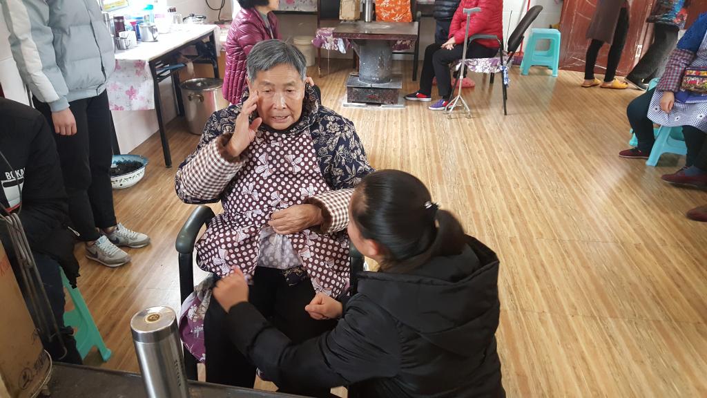 老人们面对面的交流,了解现在的生活状况,听他们讲述年轻时候的故事,和他们一起唱红歌,共享他们的革命情怀,还为他们揉揉肩,捏捏腿。